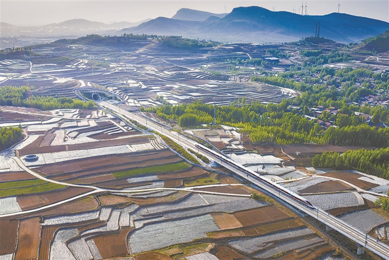一列复兴号列车行驶在日兰高铁日����� �������Ƴ������������ �������Ƴ������������ �������Ƴ������������ �������Ƴ������曲段,穿过山东省济宁市泗水县圣水峪镇的梯田,驶����� �������Ƴ������������ �������Ƴ������������ �������Ƴ����������� �������Ƴ�������向沂蒙山区。段更阳 摄